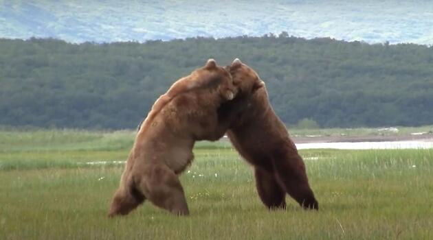 Косолапые самцы, не поделив медведицу, устроили разборку на глазах у туриста на Аляске
