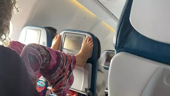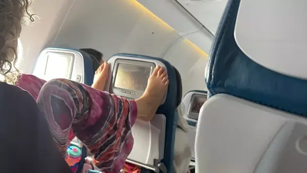 На снимке видно, что пассажирка запрокинула ноги на спинку следующего стула и пальцами на ногах переключала каналы на экране.