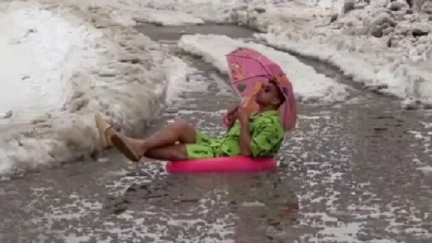 В саратовских пабликах появилось видео с «отдыхающим» в огромной луже мужчиной. Гражданин в рубашке-гавайке и шортах с розовым зонтом в одной руке и бокалом в другой плюхается в надувной круг прямо в ледяную воду. Авторы ролика предлагают угадать город, где это происходит. Без трудностей подписчики опознали Саратов и конкретно место съемок — улицу Крайнюю.