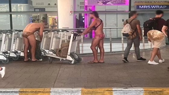 В Таиланде один из посетителей аэропорта опубликовал в социальных сетях снимок, который сразу же привлек к себе внимание. На снимке были два иностранных туриста, которые несмотря на то, что находились в международном аэропорту Пхукета, были одеты в крошечные плавки-бикини.