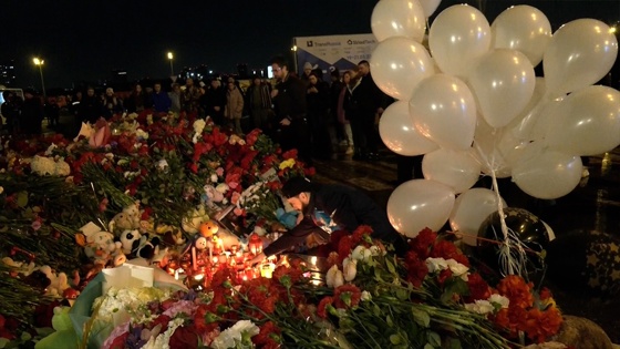 Сотни человек несут свечи и цветы к месту теракта в «Крокус Сити Холле». Сейчас его территория оцеплена, полиция никого не пускает за ограждение. Люди организовали стихийный мемориал. Многие приходят целыми семьями, приносят мягкие игрушки и воздушные шары. Кто-то вкладывает в цветы записки со словами соболезнований, у многих на глазах слезы. Рядом накрыты столы. Волонтеры предлагают пришедшим горячий чай и печенье.