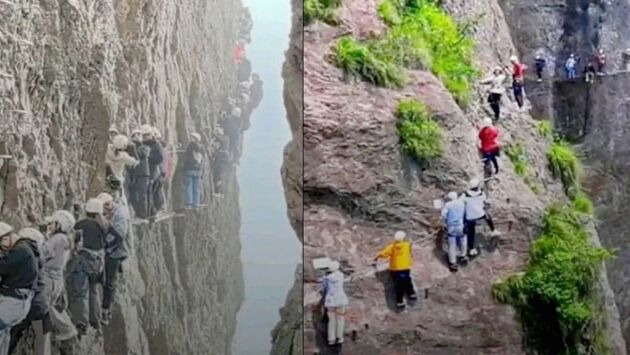 На попавшем с соцсети видео показана драматическая картинка, где туристы прижались к скалам над пропастью. В таком состоянии также оказалось несколько детей.