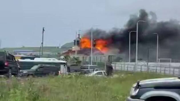 Как видно на опубликованных кадрах, огонь полностью охватил строение ярким пламенем, над территорией валит густой черный дым.