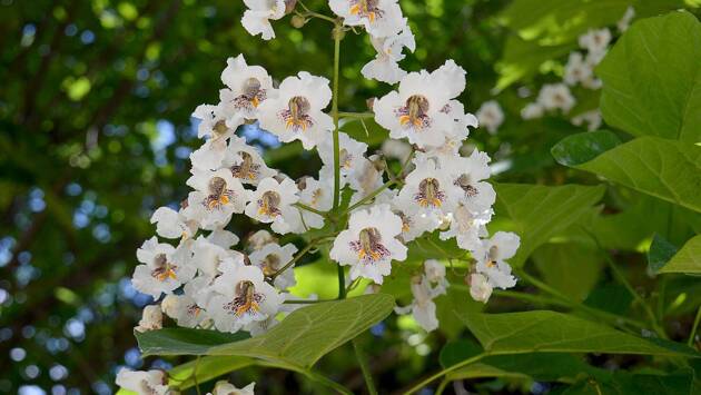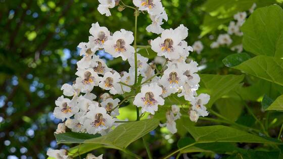 Катальпа бигнониевидная (Catalpa bignonioides) украшает сад яркими белыми цветами с пятнами красно-коричневого оттенка. Каждый из них достигает около восьми сантиметров в диаметре. Цветение продолжается примерно 20 дней с июля до начала августа.