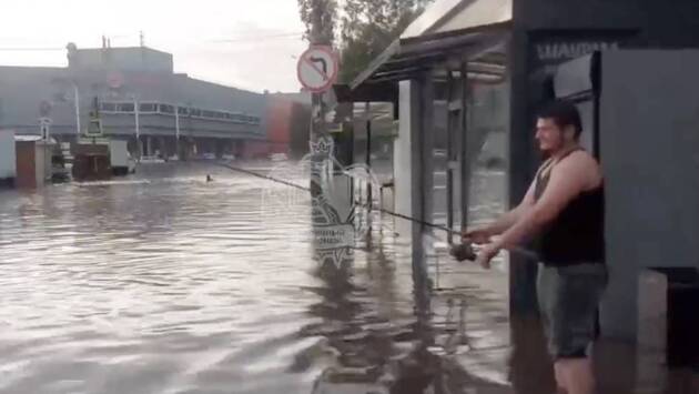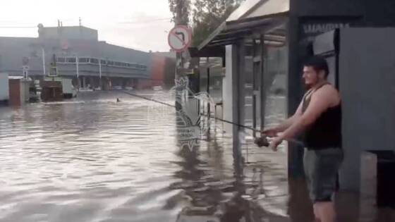 Житель российского города вышел порыбачить на затопленную улицу и попал на видео