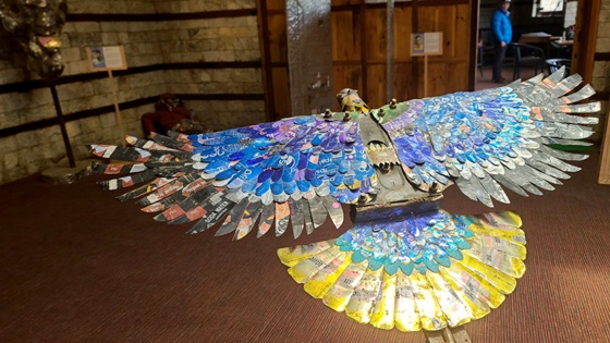 Внутри - тишина, как в храме. Из алюминиевых банок выросло "воображаемое дерево". В углу сидит фигура альпиниста, набитая пластиковыми бутылками и жестянками, - точная метафора человека, утонувшего в собственных отходах. На подставках расставлены фигурки яков, птиц и насекомых, сделанные из обломков железа и крышек от пива.