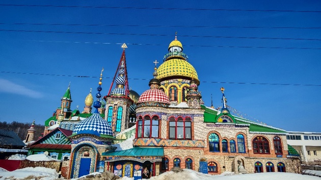 Архитектурный ансамбль храма совмещает элементы православной и католической церквей, мусульманской мечети, иудейской синагоги, буддийского храма и китайской пагоды. Идея создания необычного здания принадлежит скульптору-монументалисту Ильдару Ханову, который в 1994 году заложил первый камень на месте родового дома.