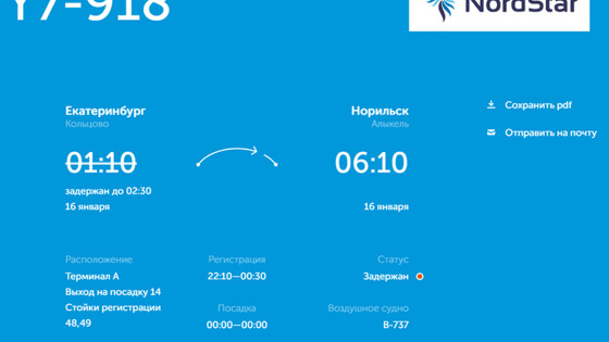 «Рейс Y7-918 авиакомпании Nord Star должен был вылететь из Екатеринбурга 16 января в 01:10, но перенесен до 02:30. Вылет рейса U6-246 авиакомпании „Уральские авиалинии“ в Красноярск планировался 15 января в 23:30, но был перенесен до 16 января 03:00. Еще один рейс U6-2903 уральской авиакомпании в Ош задержан с 16 января 01:55 до 07:00. Рейс FZ-980 авиакомпании Fly Dubai в Дубай намечался 16 января в 02:30, однако его задержали до 04:05», — следует из онлайн-табло Кольцово.