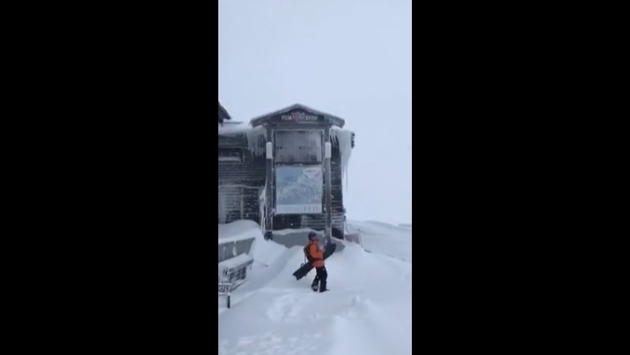 На кадрах запечатлено происходящее на отметке «Роза Пик», расположенной на вершине горного хребта Аибга на высоте 2320 метров — видно, что территория смотровой площадки заметена плотным слоем осадков.