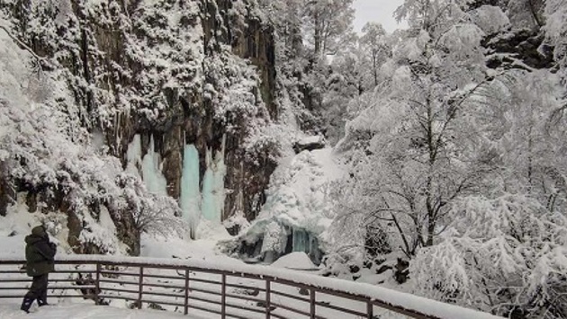 Водопад Корбу освободился ото льда в середине зимы в Алтайском биосферном заповеднике