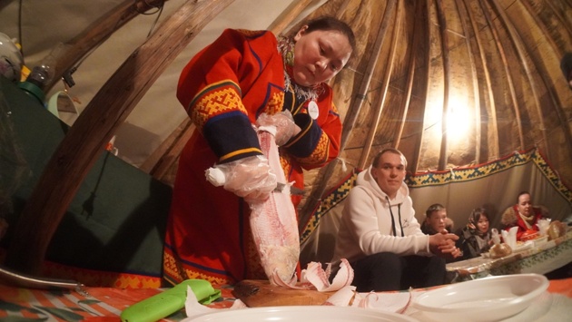 Чумработница Наталья Вэнго устраивает пир на весь чумовой мир. Ее задача - виртуозно снять тонкую-претонкую стружку со щекура, сварить бульон из оленины, разложить по вазочкам морошку, бруснику, клюкву, а потом удивлять обедающих рассказами о кочевой жизни. Это не обычная сотрудница парка, а душа-хозяйка, мастеровая и знающая. Слушать ее истории - одно удовольствие. Например, про шесты, которые подойдут для установки жилища, про заготовку шкур и, конечно, про традиционные игрушки ненецких ребятишек.