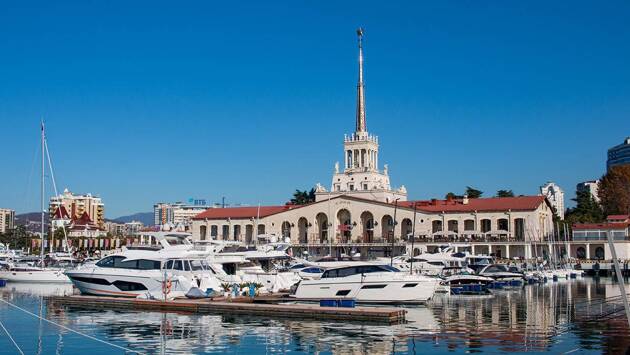 Морской порт в Сочи — одно из самых красивых мест Центрального района. Он был построен еще в 1955 году — период, когда борьба с архитектурными излишествами еще не развернулась во всю мощь. Поэтому здание вокзала возводилось архитекторами Каро Алабяном и Леонидом Карликом по всем канонам сталинского ампира. Центральная башня украшена скульптурами, символизирующими времена года и стороны света. А на шпиле высотой 71 метр установлена трехметровая звезда — увеличенная копия звезды ордена Великой Отечественной войны 1-й степени. При этом вокзал — не только архитектурный памятник, но и часть действующего морского порта. Отсюда каждый день ходят также прогулочные теплоходы, и здесь находится одна из самых больших в нашей стране стоянок для яхт. Возможно, поэтому сегодня это одно из самых «гламурных» мест города. На двух этажах вокзала расположены бутики различных люксовых брендов, а обилие позирующих на фоне яхт, поражает воображение. Впрочем, если прийти с утра, можно сделать красивые кадры без людей на заднем плане. Кстати, Сочинский морской вокзал в свое время «засветился» и в кинематографе.