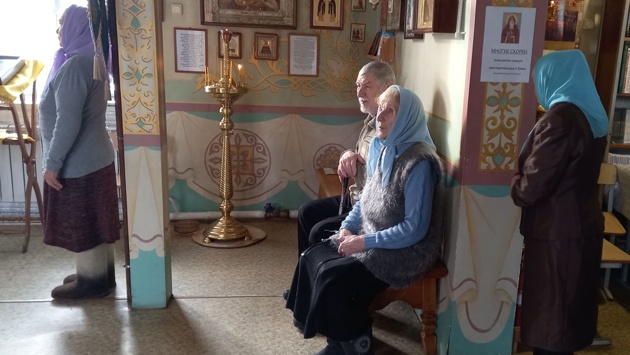 Долго бродить вокруг да около не стали - не сезон для прогулок. В храме у входа иконная лавка, тут же бочки со святой водой, графин и стакан, если кому захочется ее испить. В детском уголке рисуют две девчушки, болтает ногами, сидя на стуле, мальчишка лет десяти. В главном зале в центре установлена икона с новым святым, на одной из стен его фото и история жизни. На службе с десяток селян, в основном пенсионного возраста.