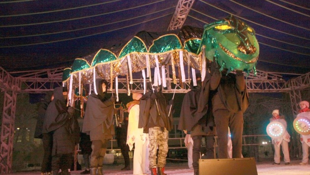 Перед тем как мудрый змей появился на городской сцене, приветственные слова в адрес ковдорчан произнесли глава Ковдорского муниципального округа Сергей Сомов, почетный гость - летчик-космонавт, Герой России Сергей Волков, председатель совета директоров МХК "ЕвроХим" Игорь Нечаев и исполнительный директор Ковдорского ГОКа Олег Михайлов.