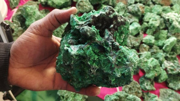 Темнокожие конголезцы в окружении глыб, булыжников и камешков малахита - как на зеленом острове. К ним подгребает молодой уральский мастер.