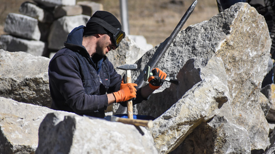 Работа каменщика в реставрации исторических памятников очень ответственная и тяжелая. Порой от одного камня зависит судьба всего памятника. Студенты в «Наследии» работают исключительно молотком и зубилом.
