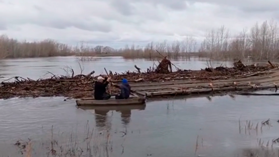 Издание передает, что мужчины, находясь на лодке, предпринимают усилия по привязке моста, чтобы предотвратить его утрату. Строение оторвало, с одной стороны, в деревне Лаптева, после чего его заметили в Кургане, проплывающим по водам реки. Этот мост был построен местными жителями в 2016 году, но уже ранее подвергался разрушениям под воздействием природных стихий, так как в прошлый раз его также снесло течением во время наводнения.