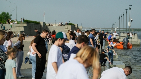 В последнюю неделю апреля в Волгограде установилась теплая, почти летняя погода. Поэтому жители и гости города-героя массово спускаются вниз к затопленным ступенькам, чтобы освежиться прохладой, которая исходит от реки, попробовать температуру воды на ощупь и даже помочить ноги.