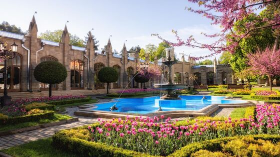 "В 1844 году Воронцов начал новую главу в своей карьере, заняв пост наместника на Кавказе с неограниченными полномочиями. Именно при его активной деятельности расцвело садово-парковое искусство, у источника нарзана начал оформляться Нижний парк", — говорит Арустамян, пока мы подходим к зданию с зубчатыми башенками, которое уже больше века приковывает взгляды гостей курорта. Это — нарзанная галерея, место, где хранится тот самый знаменитый нарзан.