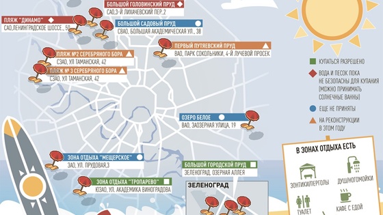 «По состоянию на 5 июня принято в эксплуатацию семь зон отдыха с купанием: Тропарево (ЮЗАО), Большой городской пруд (ЗелАО), Черное озеро (ЗелАО), Мещерское (ЗАО), озеро Белое (ВАО), пляж «Динамо» (САО), Головинские пруды (САО)», – говорится в сообщении.