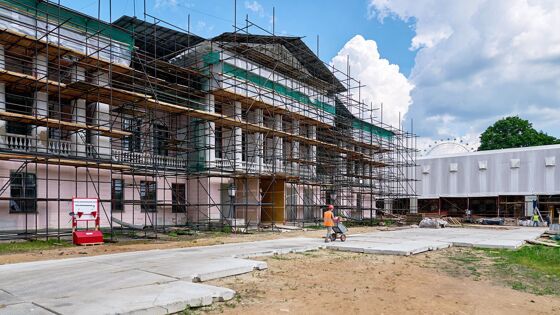 Реставрация началась и в западном крыле дворца — Итальянском павильоне, который считается самой нарядной частью усадьбы из-за обилия зеркал, золоченых панно, лепных порталов и мраморных скульптур. Сейчас его фасад огорожен строительными лесами и разрисован небольшими облачками. Такими пометками реставраторы обозначают особенно пострадавшие участки штукатурки, которые затем будут отбиваться и заменяться новыми.