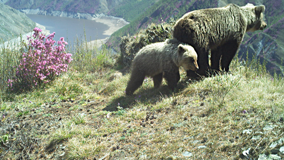 Фотоловушка зафиксировала в Саяно-Шушенском заповеднике на юге Красноярского края медведицу с отпрыском, занимающихся каждый своим делом на фоне цветущих рододендронов и живописных скал.