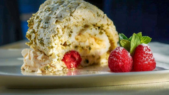 Например, в меню есть «Райское яблочко», запеченное с изюмом, курагой и местным медом. Любители более сытных десертов могут заказать хрустящие блинчики.