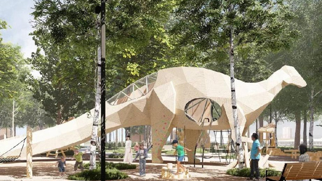Судя по проекту, в парке 40 лет ВЛКСМ появится динозавр на детской площадке, домики-павильоны, зона с шезлонгами. В глубине парка разместят несколько видов прогулочных маршрутов.