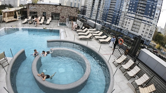 Самая настоящая библиотека с высокими потолками и книжными полками с томами классической литературы и правда здесь смотрится непривычно. В ближайшее время сюда придет с лекцией известный психолог Александр Колмановский. Тут же, на цокольном этаже, несколько маленьких бассейнов разной формы и глубины для детей и взрослых. А еще травяная экопарная "Луговая", жаркая парная "Берлога", хаммам, детская и шоу-парная "Вокруг Света". На первом этаже - современный рынок и различные магазинчики. На втором - фудкорт с тремя десятками кафе разных кухонь мира. Ну а сам 40-метровый открытый бассейн с подогревом и панорамной парной - на крыше здания. В нем нет привычных дорожек, как в спортзалах, конфигурация скорее напоминает большой завиток с зоной джакузи с необычным круговоротом. Плавая или отдыхая на лежаках, через стеклянную загородку можно позагорать, полюбоваться новым сквером, видами своего района. Новинка, похоже, зашла: даже в будни народу много. На шезлонге замечаю коляску-колыбель с малышкой. "Моя дочка, Марина, всего три месяца, - рассказывает "РГ" мама девочки Евгения Гусева. - Решили с сестрой взять ребенка и пойти расслабиться. Ощущения отличные: появление такого бассейна в паре сотен метров от нашего дома на улице Академика Янгеля - просто счастье. Если бы муж был дома, а не на работе, мог бы за нами наблюдать с 20-го этажа".