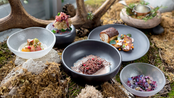 В сет входят: соленые грузди с гречкой и кремом из подосиновиков, гусиная печень со сладкими томатами, нежный осетр с запеченными овощами и соусом из антоновки, благородная цесарка с тыквенной полбой и манка с соусом из бузины в качестве десерта.