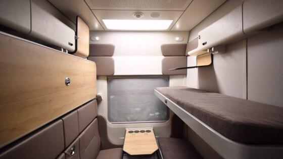 “Спальные места в купе вагона габарита Т на 15 см длиннее обычных. Каждое оборудовано розетками, выключателями света и сейфами. Для пассажиров верхних полок предусмотрены индивидуальные столики”, - указано в пресс-релизе.