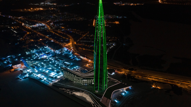 «Лахта Центр» в Санкт-Петербурге превратился в гигантскую елку. 462-метровая башня засверкала зелеными огнями