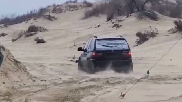 На кадрах виден внедорожник, рассекающий по песку. Водитель говорит, что выехал на пляж в поисках собаки. Инспектор ГАИ указывает ему на допущенные нарушения.