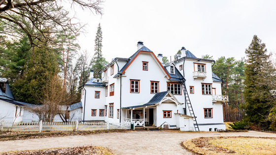 По дороге от входа на территорию усадьбы к Большому дому вы пройдёте мимо выложенного из валунов коровника с оригинальной мансардой, встроенной в крышу. Здесь же, слева от дорожки, есть конюшня, каретный сарай, погребица и сенной сарай.