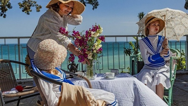 На фоне гурзуфских скал и моря прогуливаются дамы с кружевными зонтиками. Мужчины в капитанских фуражках сидят за столиками летних кафе. Так натурщики претворяют в реальность образы начала XX века.