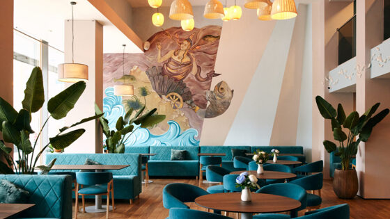 Залитое светом двухуровневое пространство нового заведения декорировала художник Марина Морозова. В пространстве солируют природные оттенки: от глубокого бирюзового, символа теплого моря, до оттенков песка. На стенах словно плещутся стайки белых рыб, а арт-объект в виде лунного диска переносит на берег моря в ночную пору.