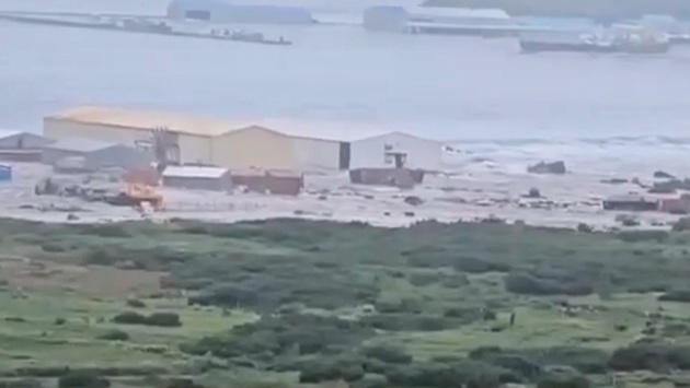 На кадрах из соцсетей видно, как цунами обрушилось на прибрежную зону Северо-Курильска, затопив одно из предприятий - предположительно, рыбный завод.