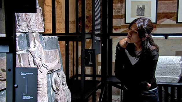 Храм стал устойчивей, но меньше. И далеко не все белокаменные фигуры вернулись на фасады. Они столетия хранились внутри собора. А сейчас - впервые его покинули. Ради выставки в столице. Вот эти 40 подлинных рельефов тринадцатого века - как отдельные буквы каменной книги. И даже легендарное белокаменное Распятие - Святославов Крест - тоже в Москве. Главная реликвия собора и одна из его загадок. Возможно, изначально украшала фасад.