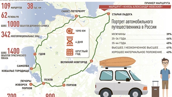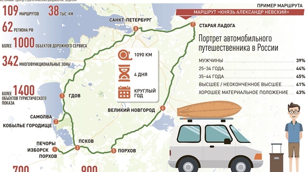 Как рассказали в ЦСР, каждый девятый туристический автомаршрут в России проходит по "Серебряному ожерелью" в северных регионах, но в ближайшие годы их может стать вдвое больше. В Центре отмечают, что на Северо-Западе страны находится более 5,3 тыс. км трасс - это 10 региональных и два межрегиональных автомаршрута. Например, межрегиональный маршрут "Князь Александр Невский" проходит от Санкт-Петербурга через Ленинградскую, Новгородскую, Псковскую области. На маршруте туристы смогут увидеть памятники истории и архитектуры, места легендарных битв и города, освобожденные и основанные князем Александром Невским.