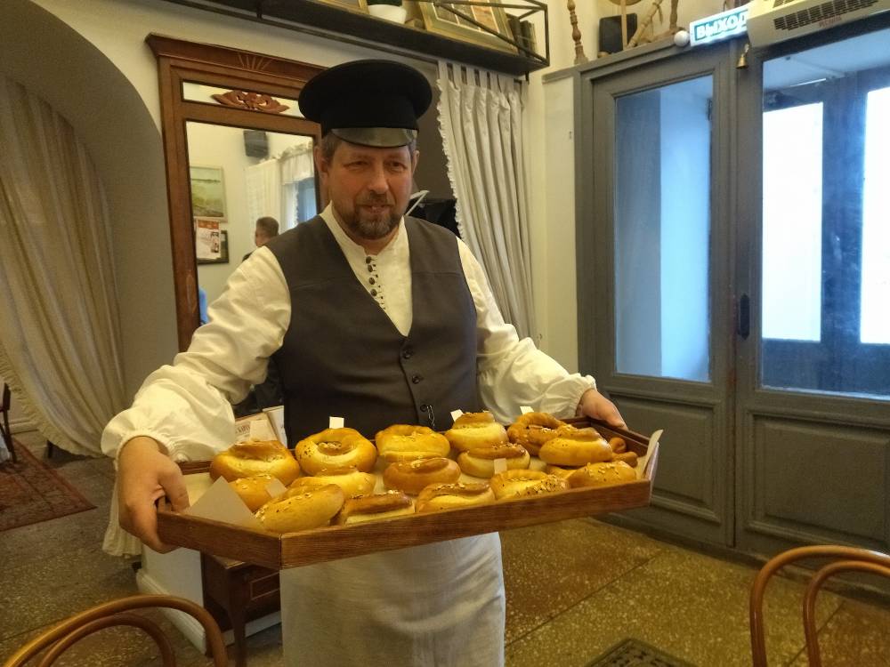 Расскажут во время гастрономической экскурсии в трактир и о старых костромских традициях чаепития. "Вот сидит купец за самоваром, горячий ароматный чай пьет. И ему несут калач горячий с пылу с жару. Он берет, открывает этот калач, поливает туда коровьего маслица, сверху добавляет две-три ложечки красной икорочки… Хорошо-то как!" - раззадоривает участников мастер-класса главный костромской калачник Константин. Ну как тут не выучиться на отлично?!