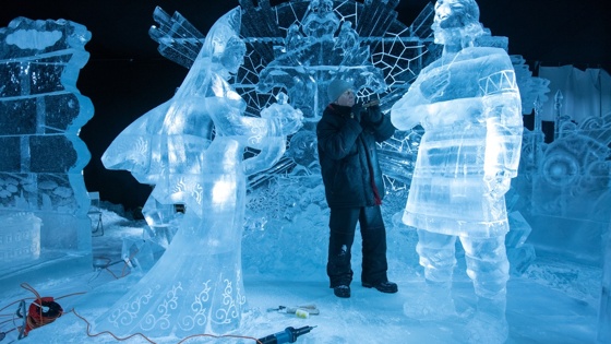 Известные челябинские скульпторы Анна Шарикова и Александр Подгорнов наводят красоту Хозяйке Медной горы, встречающей Данилу-мастера. "Мы живем на южном Урале, и сказы Бажова - наш бренд, - рассказывает Анна. - По льду у нас сезонная работа, а в течение всего года мы просто скульпторы: занимаемся малыми и монументальными формами, керамикой, деревом и так далее. Над "Каменным цветком" трудились две недели с перерывами на чаепития, чтобы согреться".
