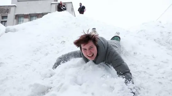 Также был опубликован ролик, на котором видно большое количество людей. Одни пытаются пройти через огромный сугроб, другие катаются с горки и делают снимки на память.