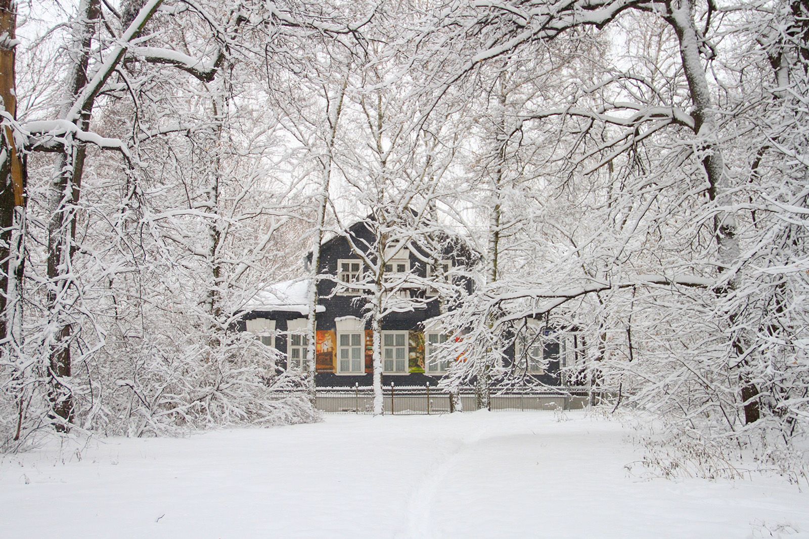 Дом прячется от города за густыми деревьями парка. И, если говорить словами Паустовского, зима здесь кажется «такой же прекрасной, как лето».