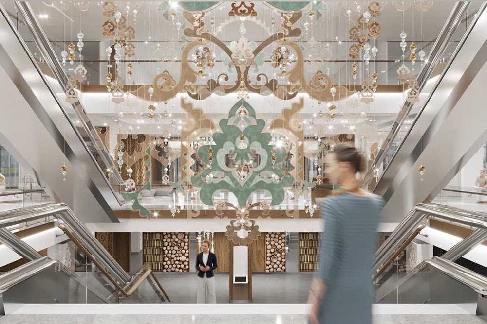 Первое, что бросится в глаза посетителям внутри, это огромная кинетическая конструкция, свисающая с потолка. Она будет двигаться под татарскую музыку, создавать разные орнаменты. Они отсылают к трем видам ремесел: кожаная мозаика, ювелирное искусство и вышивка.