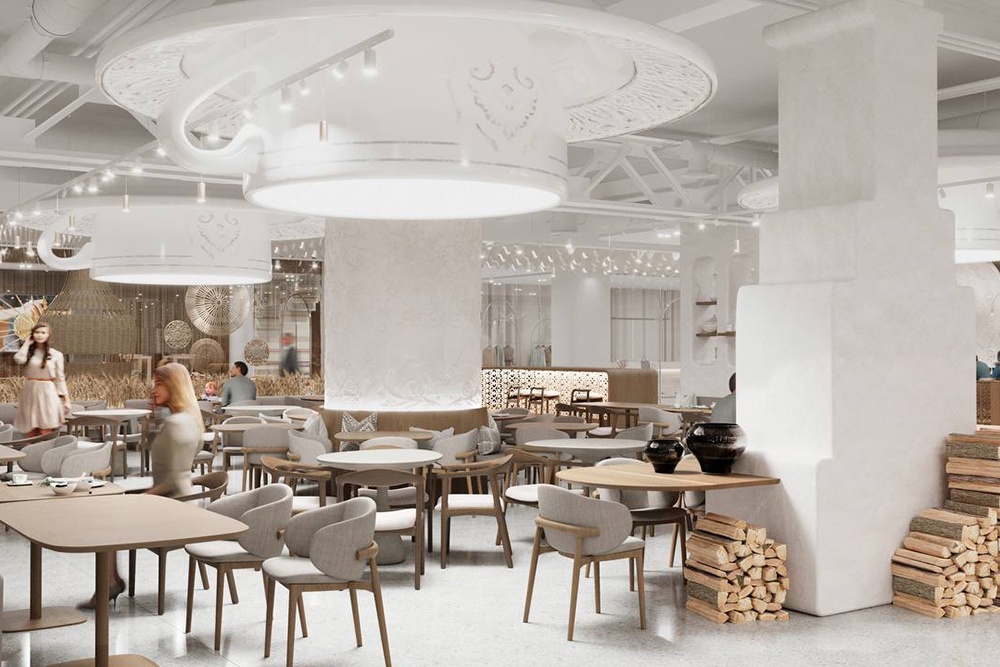 В сердце здания, по словам архитектора, расположится зона татарской кулинарии. Стены здесь украсит узор из гипсовых эчпочмаков (треугольная выпечка с начинкой из картошки и мяса) и беккенов (пирожки с капустой и яйцом). Освещать пространство будут плафоны в виде чашек с чаем на блюдцах диаметром четыре метра. Воссоздадут здесь и деревенские ворота с татарским домиком, а также установят имитацию печи. Место для кулинарных мастер-классов стилизуют под сруб, украшенный орнаментов из чак-чака.