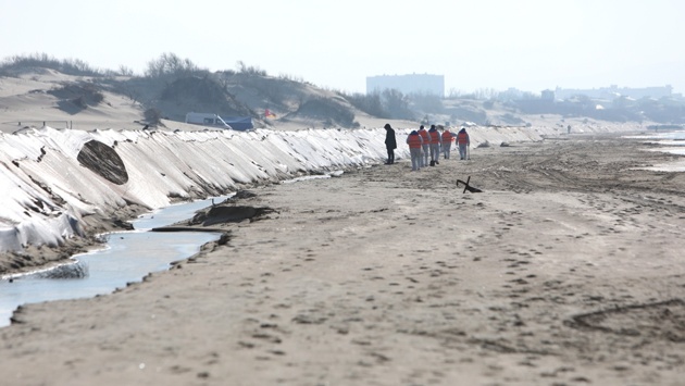 В четверг днем разбушевавшееся Черное море смывало валы, установленные в Анапе для защиты от нефтепродуктов после аварии двух танкеров в Керченском проливе.
