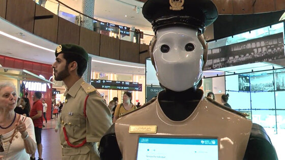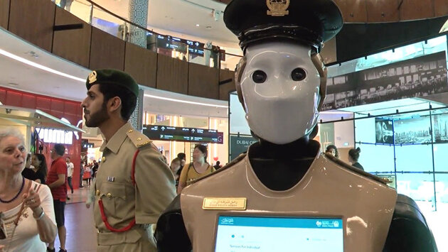 Робот-полицейский ростом 1,67 метра с головой, двумя руками и сенсорным экраном в груди — передвигается на колесах. Теперь робот патрулирует туристические места и торговые центры.