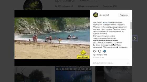 В понедельник, 10 июля, отдыхающие на пляже Морские глубины приморцы увидели тело ларги на берегу, сообщает PRIMPRESS. Через два дня, 12 июля, отдыхающие не выдержали и «отбуксировали» тело животного в море на лодке. Соответствующее видео появилось в канале dps_control в «Инстаграм». Специалисты установили, что до того, как появиться на берегу, тело ларги дрейфовало в море. Скорее всего, животное умерло своей смертью. A post shared by ДПС-Контроль. [Приморье] 18+ (@dps_control) on Jul 11, 2017 at 10:18pm PDT