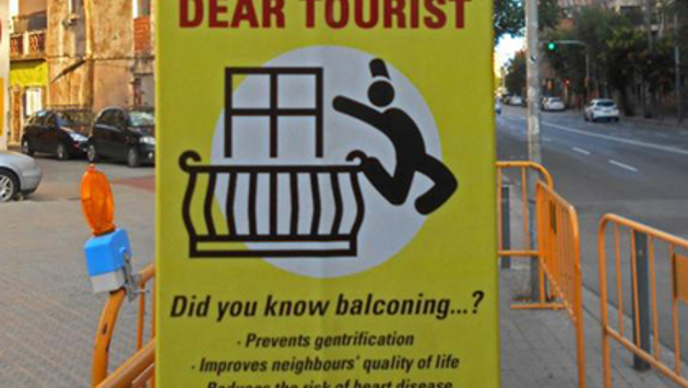 В Барселоне появились постеры и граффити, призывающие туристов к суициду. Об этом сообщает The Times. Такие плакаты были замечены в популярных туристических местах, например, рядом с парком Гуэль. Пресс-секретарь городского совета Барселоны заявил, что эти послания будут устранены в ближайшее время. Никто не взял на себя ответственность за распространение сообщений, однако местные жители уверены, что это часть кампании по борьбе с большим числом туристов, которые отравляют жизнь испанцам. Ранее в июне члены радикальных левых течений Каталонии придумали новый метод борьбы с туристами — силиконовый клей. Участники крайне левой организации Edvant, поддерживающей «Кандидатуру народного единства» опубликовали в сети ролик, на котором они замазывают замки хостелов, туристических офисов, прокатов велосипедов и камер хранения с помощью силиконового клея и скрепок. В августе 2017 года участники левого молодежного движения Arran Jovent, связанного с партией «Кандидаты народного единства», атаковали туристический автобус рядом со стадионом в Барселоне и также расписали стены города лозунгами «Туристы, убирайтесь домой!» Они считают, что нынешняя модель туризма заставляет людей работать за низкую зарплату, изгоняет их из привычных мест обитания и разрушает традиционные связи.
