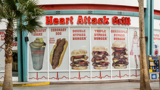 Ресторан Heart Attack Grill в Лас-Вегасе считается самым вредным в мире. Абсолютный хит меню - бургер Quadruple Bypass Burger, которые весит 900 грамм и содержит 8000 килокалорий. Тому, кто закажет такой бургер, разрешают покататься в инвалидном кресле. Звучит неприятно, но посетителям нравится.